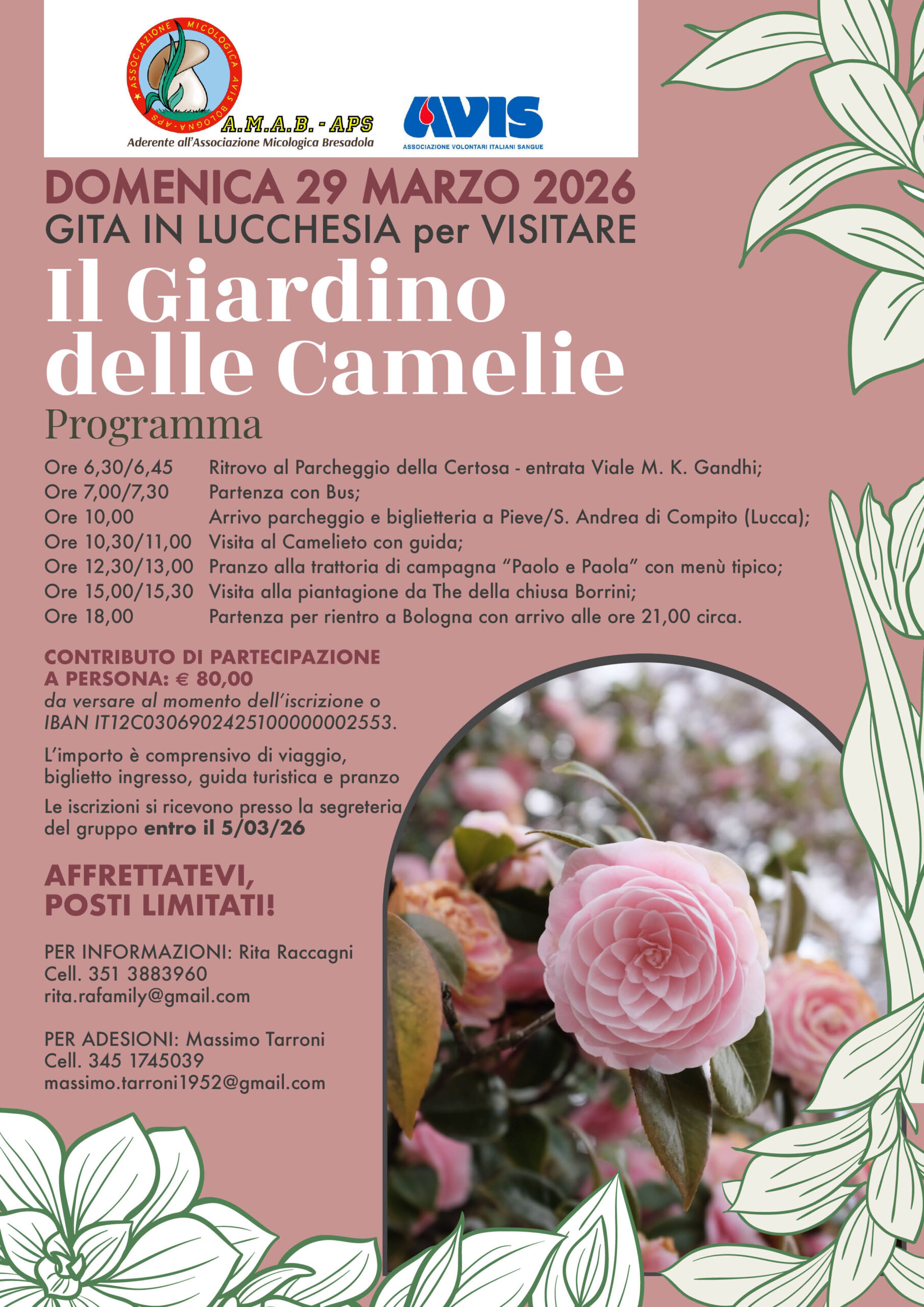 Vi informiamo che Domenica 29 marzo 2026 abbiamo organizzato una gita per voi e per i vostri familiari al “GIARDINO DELLE CAMELIE” nel borgo medievale di Sant’Andrea di Compito a pochi chilometri da Lucca.