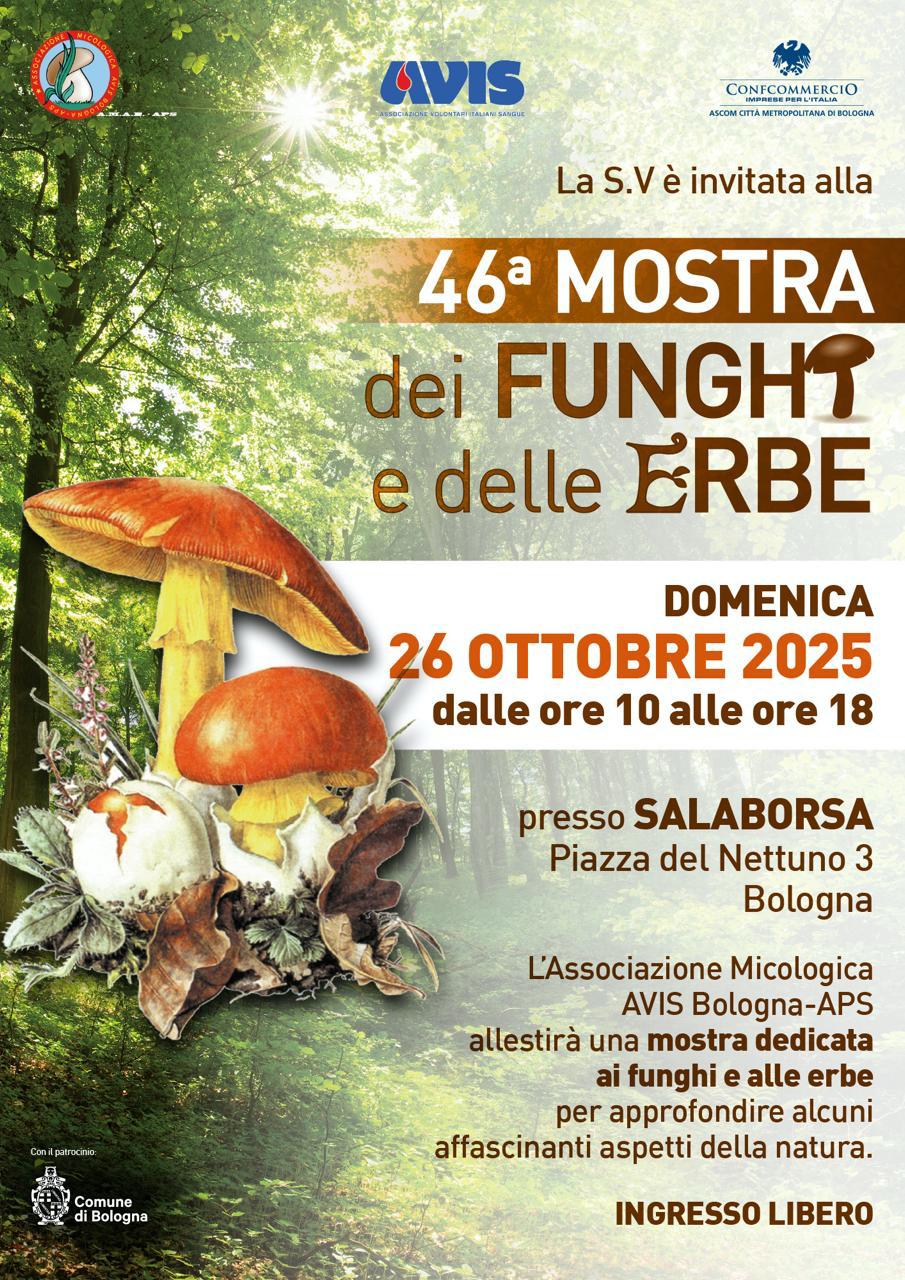 Siamo lieti di annunciare che domenica 26 ottobre 2025, dalle ore 10 alle ore 18, nella splendida cornice della Salaborsa in Piazza del Nettuno a Bologna, con il patrocinio del Comune di Bologna e di Confcommercio – Ascom Città Metropolitana di Bologna, si terrà la quarantaseiesima edizione della “Mostra dei Funghi e delle Erbe”. Ingresso libero.