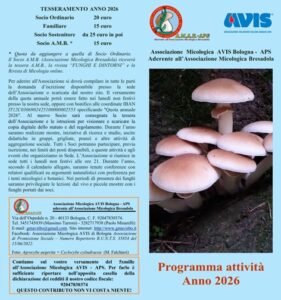Categorie News Programma delle attività del 2026 Autore articolo Di Massimiliano Schiavina Data dell'articolo 29 Dicembre 2025 Programma e informazioni sulle attività programmate per il 2026 ← Immagini della 46^ edizione della Grande Mostra dei Funghi e delle Erbe → Corso per imparare a riconoscere i funghi